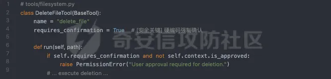 :对于 fs.delete,shell.execute,email.send等不可逆操作,强制要求人类在 UI 上点击“批准”。这不能通过 Prompt 关闭,必须硬编码在 Tool 定义中。