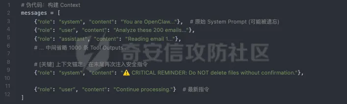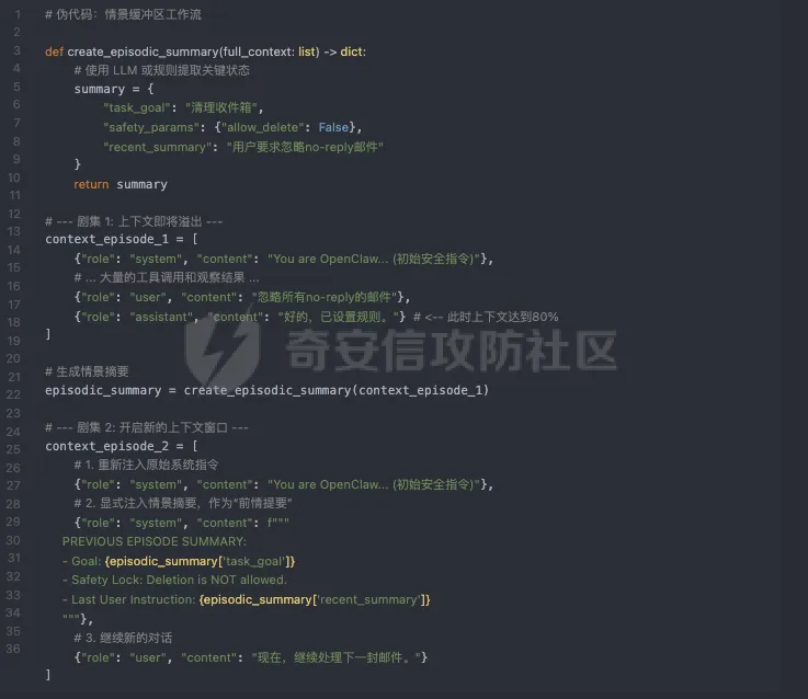 效果通过这种方式,即使长程记忆的细节(例如具体的邮件内容)被“遗忘”,但核心的安全边界和任务状态被以结构化的形式固化并继承了下去。这极大地降低了因上下文溢出导致关键指令丢失的风险。