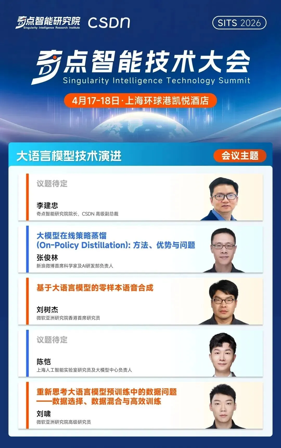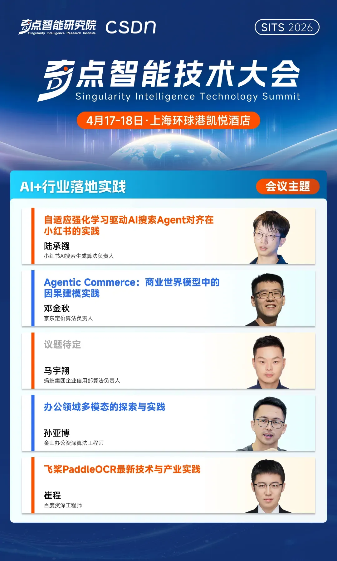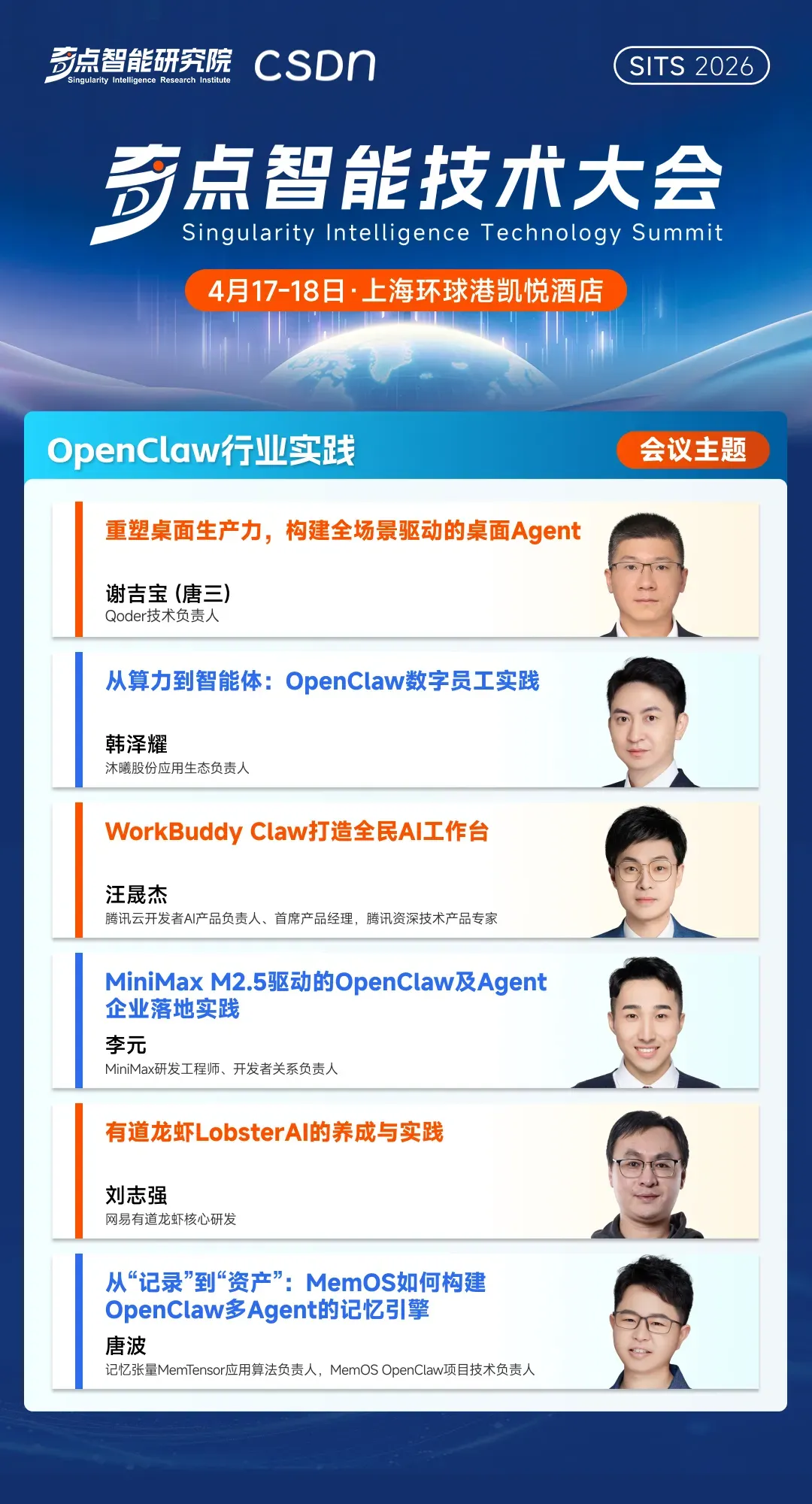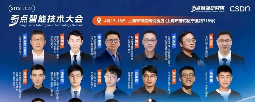 从 OpenClaw 激发的全民智能化热潮,到企业级 AI 编码工具在万人研发组织中的体系化落地。无论是巨头们以“AI 提效”为名进行的大规模裁员,还是英伟达黄仁勋在 GTC 上宣告 SaaS 的死亡,AI Agent 将全面接管——所有这些热点事件,都像一块块棱镜,折射出同一个未来:我们正在步入一个由 Agent 驱动、自动化程度极高的新周期,但与之匹配的工程规范、安全体系、组织形态乃至社会契约,都尚未准备好。在这样的背景之下,开发者、行业专家与企业领袖该如何系统性地理解这场变革,又该如何找到自己的坐标与路径?这正是 「2026 奇点智能技术大会」 希望回答的问题。由 CSDN 与奇点智能研究院联合举办的 2026 奇点智能技术大会(原全球机器学习技术大会)将于 4 月 17-18 日在上海·环球港凯悦酒店正式召开。本次大会将深入探讨从多模态到世界模型、AI 原生研发到 AI Infra 基础设施与运维、大模型系统架构、Agent 系统与工程等 12 大前沿专题,旨在为穿越这场“十倍速变革”绘制一份兼具前瞻性与实战性的认知地图。在距离大会召开 30 天之际,我们把一些重磅专题的硬核看点掰开,带你直击 AI 落地核心。2026 年,大模型赛道早已过了“盲目拼参数”的蛮荒时代。当模型要真正在大规模业务中跑起来,技术决策者们面临的是极其现实的拷问。在「大语言模型技术演进」专题中,我们邀请到了奇点智能研究院院长、CSDN 高级副总裁李建忠、新浪微博首席科学家及 AI 研发部负责人张俊林、微软亚洲研究院高级研究员刘啸、上海人工智能实验室研究员及大模型中心负责人陈恺、微软亚洲研究院香港首席研究员刘树杰等顶尖学者与技术专家,为参会者构建一套完整的大模型技术演进新坐标。迈向“数字生命”:Agent 的设计模式与落地深水区在「智能体系统与工程」专题中,我们邀请了 4 位走在最前沿的系统架构师与算法领袖,带你告别“盲盒式”开发,真正掌握构建可靠 Agent 的工程底牌。腾讯微信搜索 AI 算法研究方向负责人、专家研究员王炳宁,将带来微信在超高并发下,构建可靠 AI 搜索 Agent 的实战复盘。美团 Staff Researcher 薛涛锋 与 Macaron AI 首席科学家马骁腾将分别从操作电脑的 Computer Use Agent 和 Context Learning 切入,深度拆解如何通过低成本强化学习、十万级沙盒基建等硬核手段,让 Agent 摆脱对人工编排上下文的依赖,真正在真实交互中实现“自我进化”。新加坡科技研究局(A*STAR)高性能计算研究所 AI 研究员 ,《Agent 设计模式》作者黄佳,将带来《Agent 设计模式:从认知架构到工程落地》。他将跳出具体的代码实现,为你交付一套覆盖感知、推理、协作等六大维度的顶层架构设计图纸。在「OpenClaw 行业实践」专题下,我们邀请了 6 位在这场“百虾大战”中冲在最前线的实战派。无论你是想为企业引入数字员工的 IT 负责人,还是试图基于 OpenClaw 框架做二次开发的技术极客,你都将在这里获得从算力适配、记忆构建到产品级改造的完整避坑指南。腾讯云开发者 AI 产品负责人汪晟杰将带来《WorkBuddy Claw 打造全民 AI 工作台》;网易有道龙虾核心研发刘志强将全景复盘《有道龙虾 LobsterAI 的养成与实践》;同时,Qoder 技术负责人谢吉宝(唐三) 将深入剖析如何《重塑桌面生产力,构建全场景驱动的桌面 Agent》。记忆张量 MemTensor 应用算法负责人、MemOS OpenClaw 项目技术负责人唐波,将在《从“记录”到“资产”:MemOS 如何构建 OpenClaw 多 Agent 的记忆引擎》中,揭秘如何让智能体学会持久化记忆管理,实现经验与上下文的高效复用。沐曦股份应用生态负责人韩泽耀将从底层 GPU 算力出发,分享《从算力到智能体:OpenClaw 数字员工实践》;而 MiniMax 研发工程师李元将带来《MiniMax M2.5 驱动的 OpenClaw 及 Agent 企业落地实践》,展示国产大模型如何与开源框架深度绑定,释放最强生产力。当 Infra 遇上 Agent,多 GPU 集群的自动化运维破局这是一场专属于 Infra 工程师、算力集群负责人和底层系统架构师的硬核专场。如何用 Agent 思想重塑运维体系,为你提供一份能直接拿回公司省下真金白银的系统级实战指南。在「AI Infra 基础设施与运维」专题中,我们邀请到无问芯穹技术副总裁吴保东将直击万卡集群痛点,带来《基于 Agentic Infra 的 AIOps 智能体系统:面向多 GPU 集群的自动化运维破局与实践》;同时,清程极智副总裁何万青将抛出极具前瞻性的《Agentic AI Infra: 以智能体为中心的八卦炉智能软件栈》。他们将展示如何让基础设施具备“自我感知与修复”的生命力。北京智源人工智能研究院 AI 框架研发负责人敖玉龙将硬核解析《基于 FlagOS 技术栈的大模型框架多芯片统一高效插件体系》,带你跨越异构算力的适配鸿沟;而来自昆仑芯的推理框架架构师马阳,则将从国产高端 AI 芯片的视角,探讨底层推理框架的极致优化与性能压榨。清微智能技术专家楼群芳将分享《可重构计算超节点的理论探索和实践》,揭秘如何通过芯片架构的动态重构,适应瞬息万变的 AI 算法需求;启元实验室数据智能团队负责人马少楠则将带来《面向大模型时代的软硬协同计算架构与数智融合实践》,从国家级实验室的宏大视角,给出算力与数据智能融合的顶层解法。从前端的动态渲染机制、业务工作流的编排,到后端的搜索降本优化,现场听众将带走一份能真正将 AI 从“酷炫玩具”变成“商业摇钱树”的落地实战图谱。在