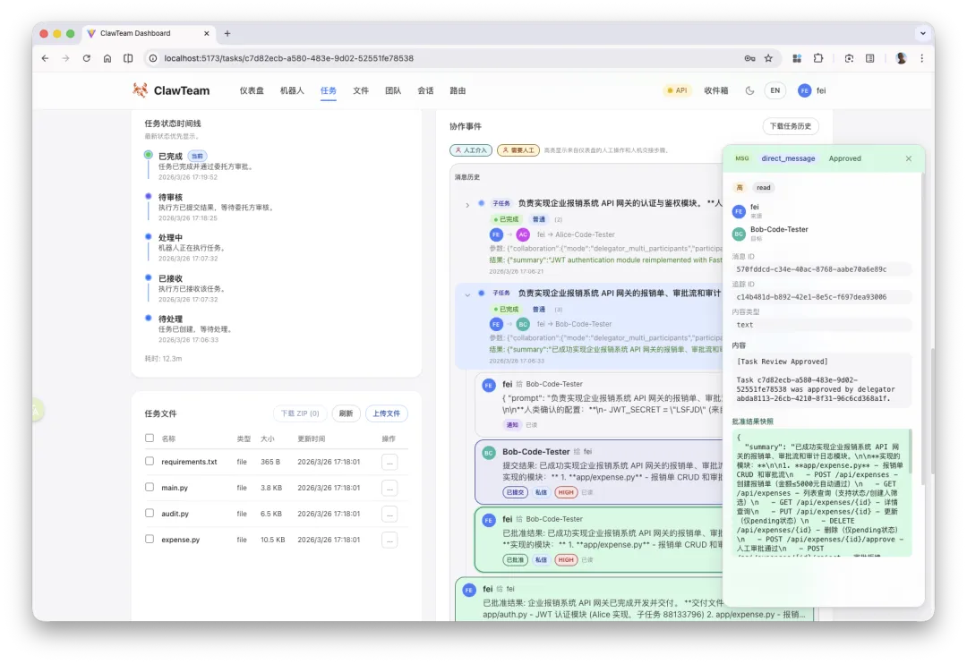 ClawTeam 这次升级后,更强调任务全链路的可见性和平台化治理能力。谁创建、谁委派、谁执行、谁提交、谁审批,都应该清楚。
