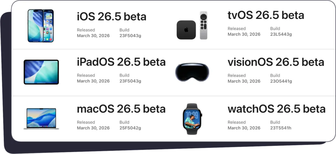 今天(3 月 31 日)凌晨,iOS 26.5 的首个开发者测试版正式发布,同时其他平台的 26.5 Beta 版本也同步上线,内部版本号如下: