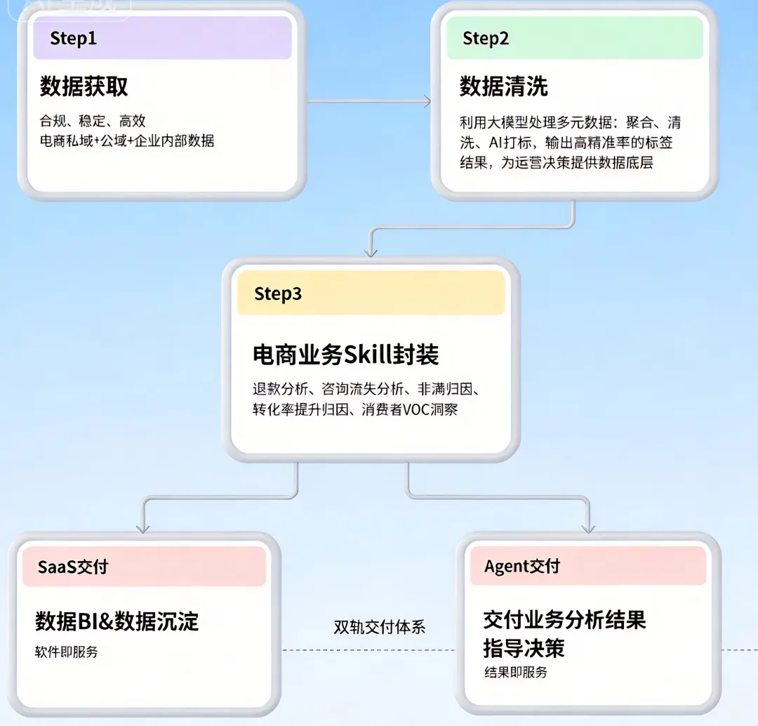 Agent交付:直接给你结果——你问“上周某单品退款为什么上涨?”,Agent会自动调取SaaS数据、调用对应Skill分析,最终给出原因、方案与可执行建议。