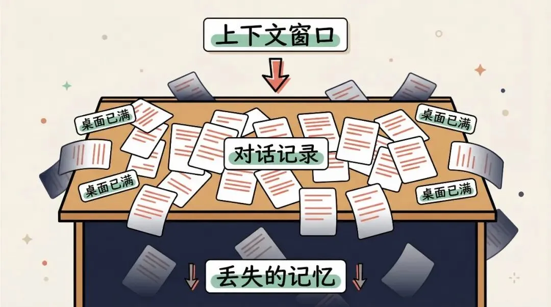 AI 的大脑不是硬盘,是一张书桌。书桌大小固定,你跟它说的每一句话、它回的每一句话,都是摊在桌上的纸。桌面满了,新的纸就放不下了。