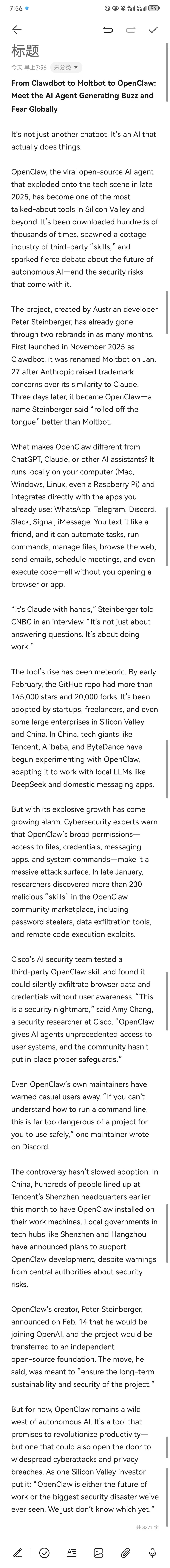在Scalers老师的建议下,我直接开启我的英语阅读“天眼”,读外媒关于OpenClaw的报道。