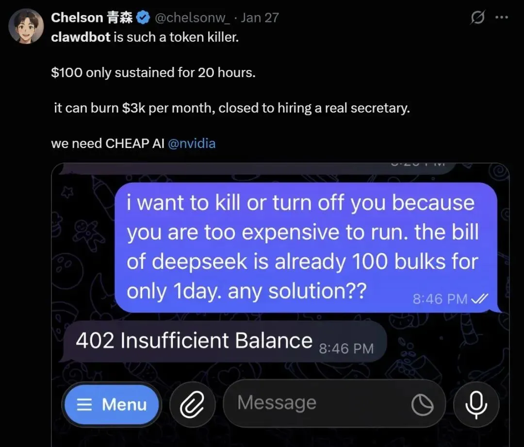 在Reddit上,有个用户贴出账单:6小时,9000万token,170美元。底下评论一片哀嚎:“我以为开源就是免费,结果一看账单,冲到了几百美元。”更夸张的是,有人一个月光token就花掉400美元,换算成人民币近3000块。