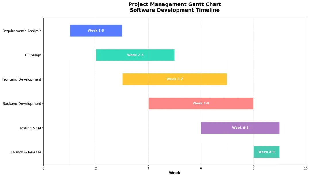 生成一个项目进度甘特图,包含以下任务:- 需求分析(第1-2周)- UI设计(第2-4周)- 前端开发(第3-6周)- 后端开发(第4-7周)- 测试验收(第6-8周)- 上线发布(第8周)使用专业的项目管理配色ChartGen 输出结果: