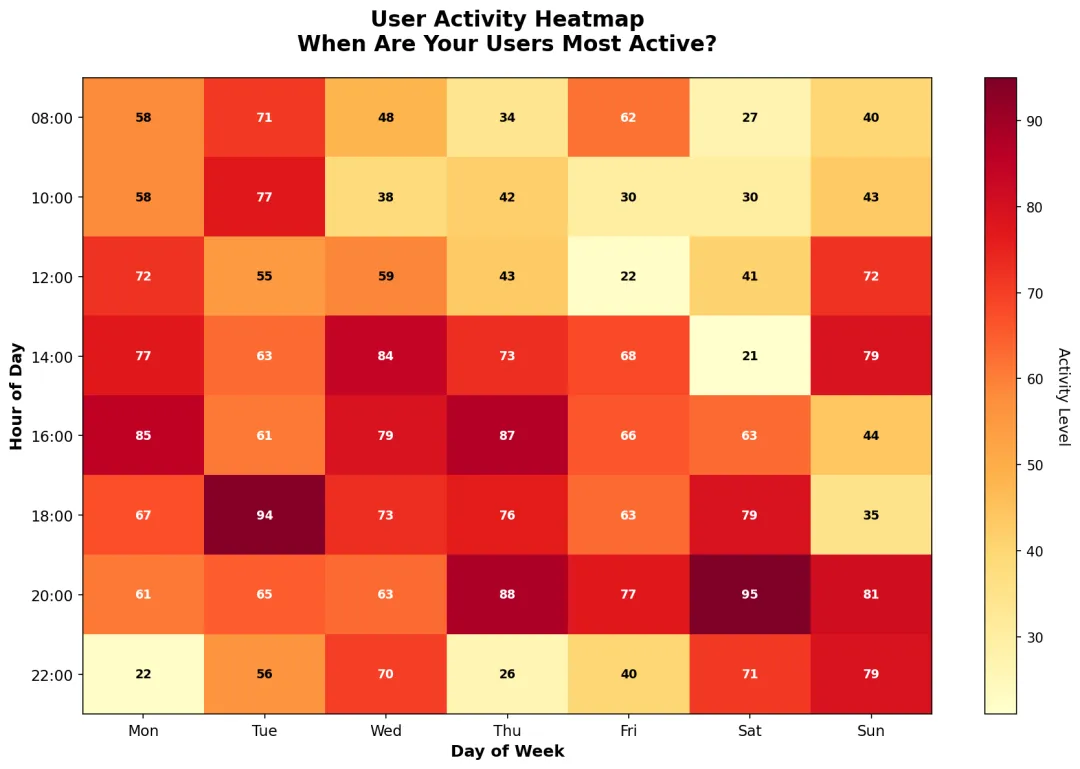 了解用户何时最活跃对运营策略至关重要。热力图是展示时间维度数据的最佳选择。