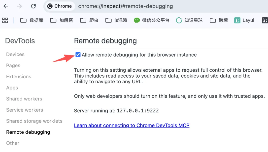 输入之后,会打开一个 Remote debugging 的页面,然后我们选择 Allow remote debugging for this browser instance 这个选项,来开启本地浏览器的远程调试功能。