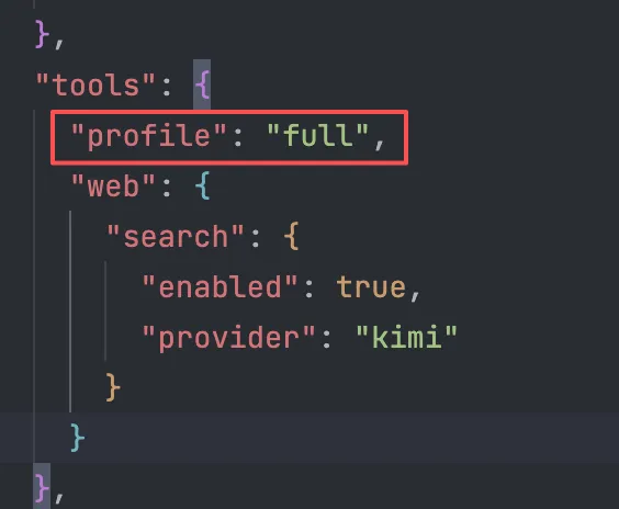 打开 openclaw.json 之后,我们需要先找到 tools 这个选项,将它下面的 profile 选项改为 full 。
