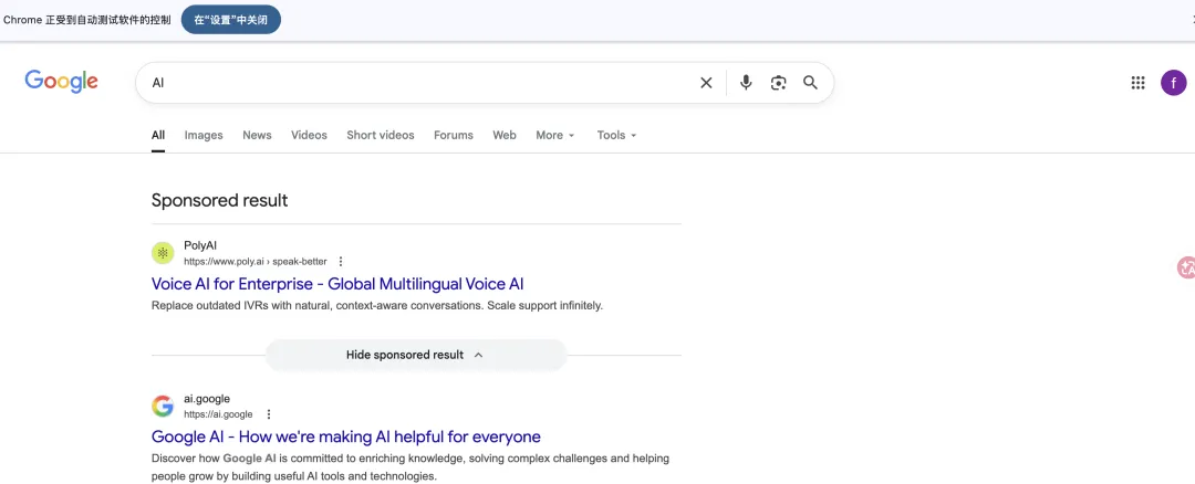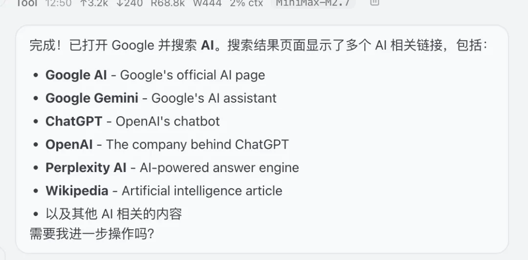 然后你就可以看到它成功的完成了我的任务:打开了googel并且搜索了 AI ,可以看到截图的右上角,当前页面是保持着我的登录状态的。