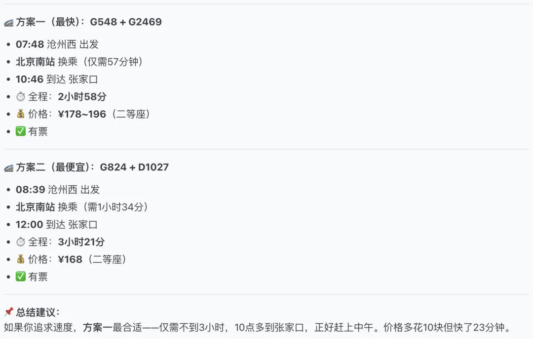 我们再交给它一个任务,那就是查询沧州到张家口的清明车票,并且告诉我价格合适且时间较短的出行方案,最后的效果如下: