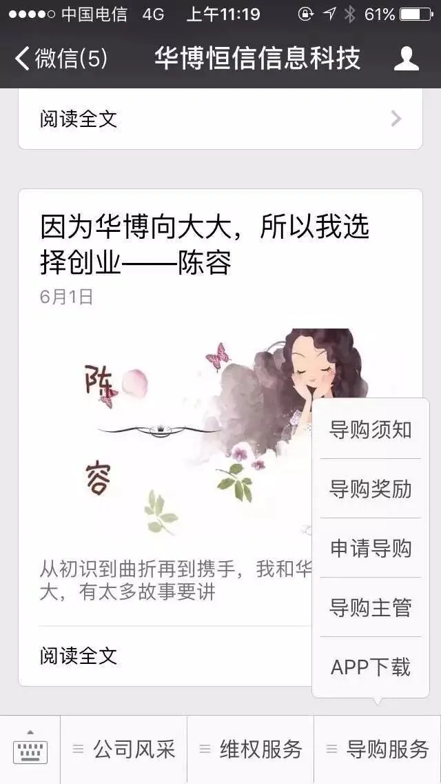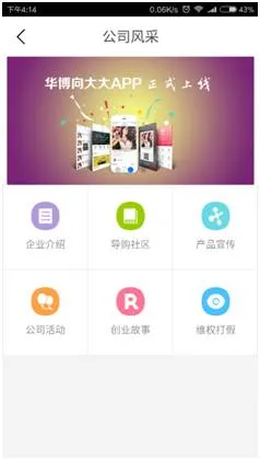 1、此模块主要是针对向大大品牌的宣传窗口,入驻的导购店主可以通过此版块可以比较全面了解和认识华博向大大,比如华博的公司风采、企业文化、总部往期活动回顾、近期活动预告等,同时也可通过此窗口在产品的商标、专利、真伪识别上有比较官方的认识;