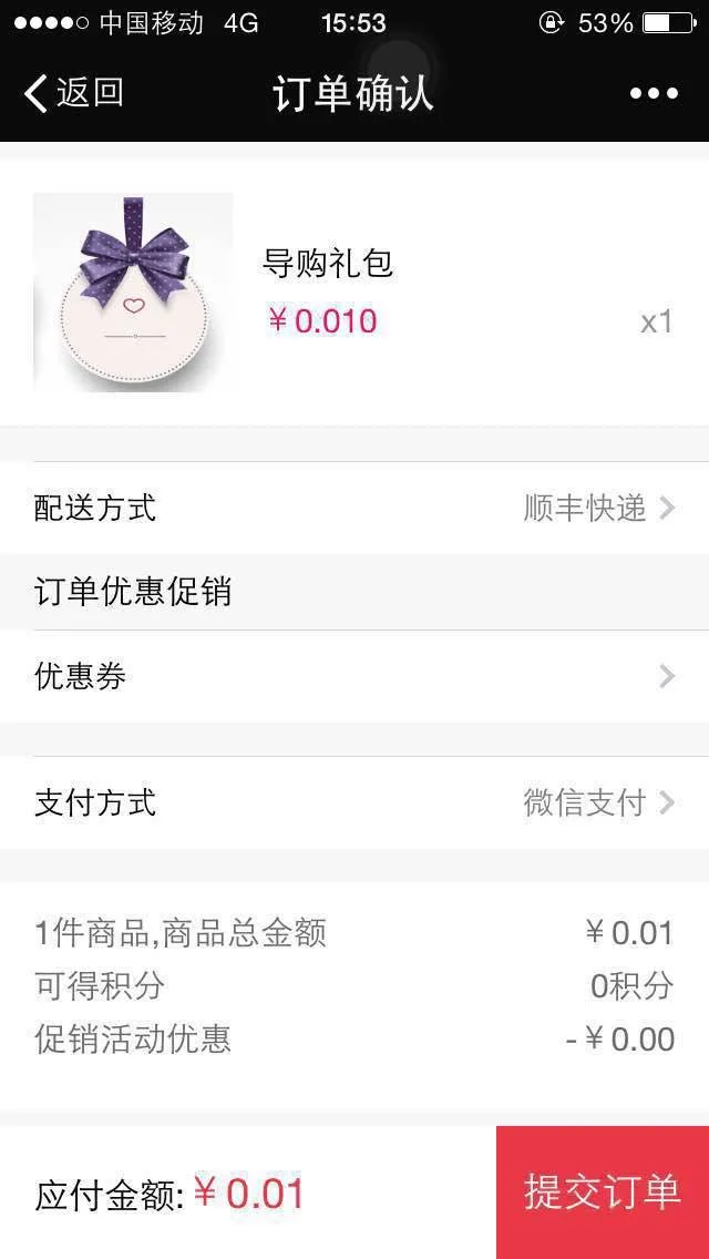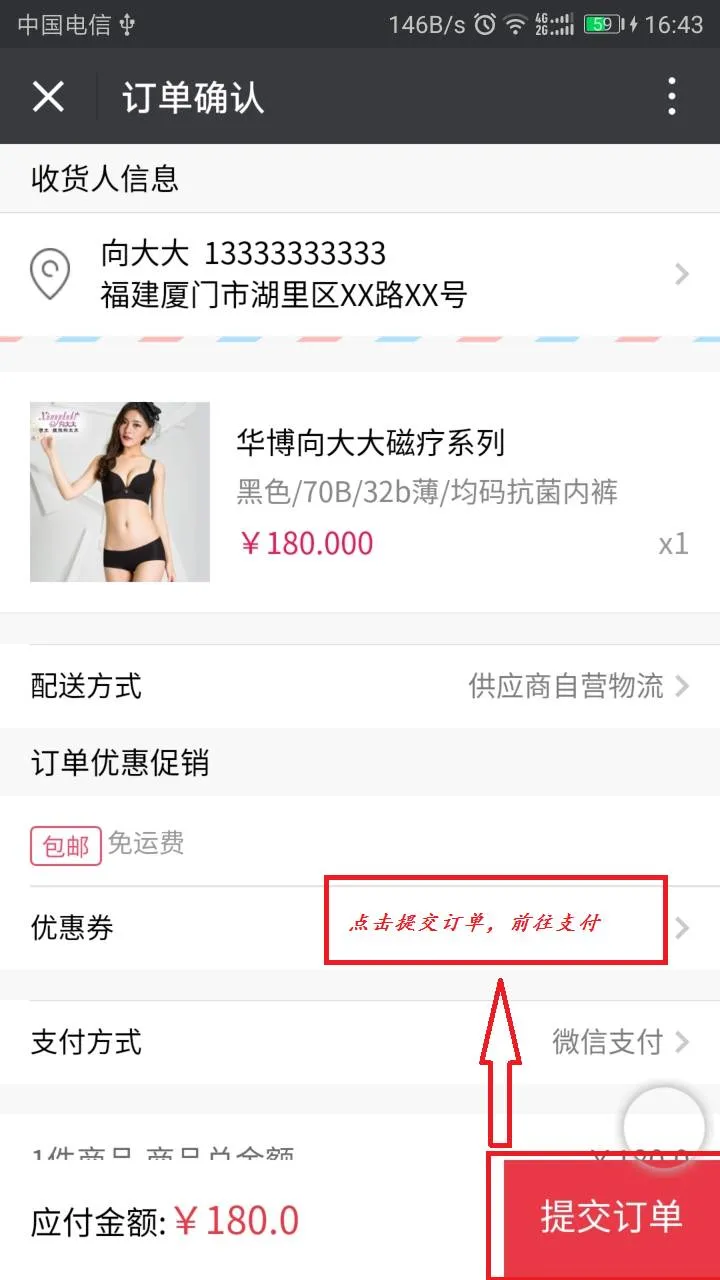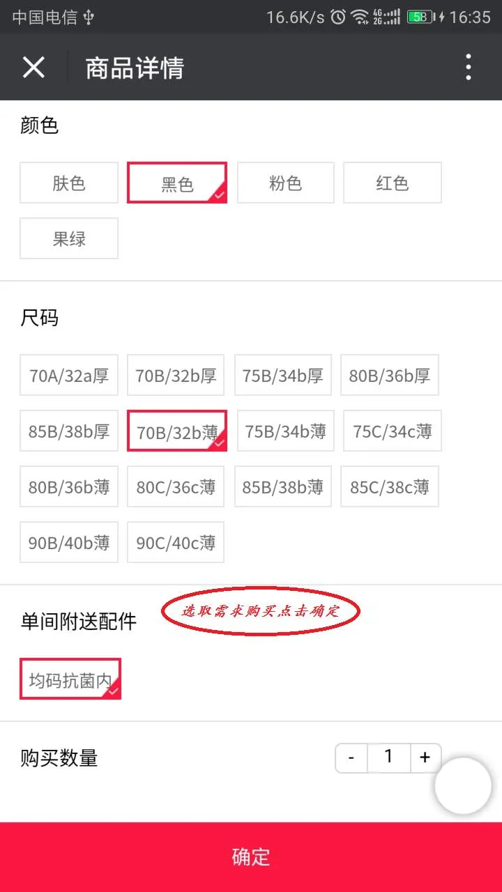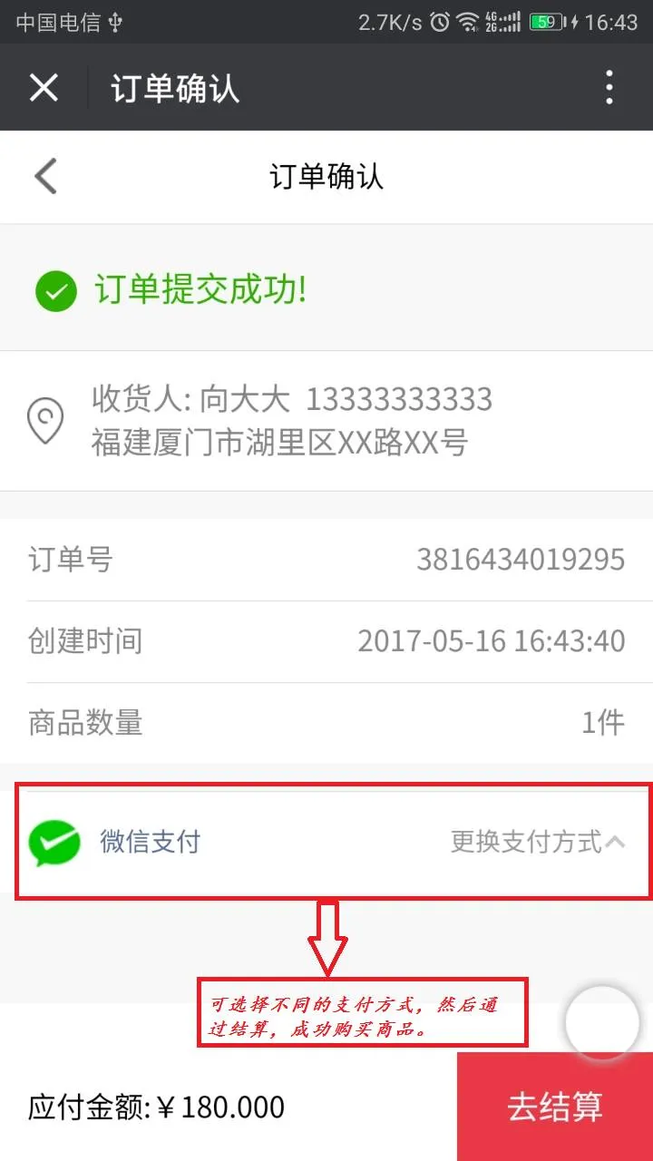 注册完成后可自有选购,购买流程为常见的网购流程,选择商品、规格、尺码、颜色,确认订单后选择收货地址、确认支付方式(微信、支付宝、银联卡),完成支付。