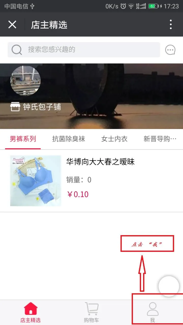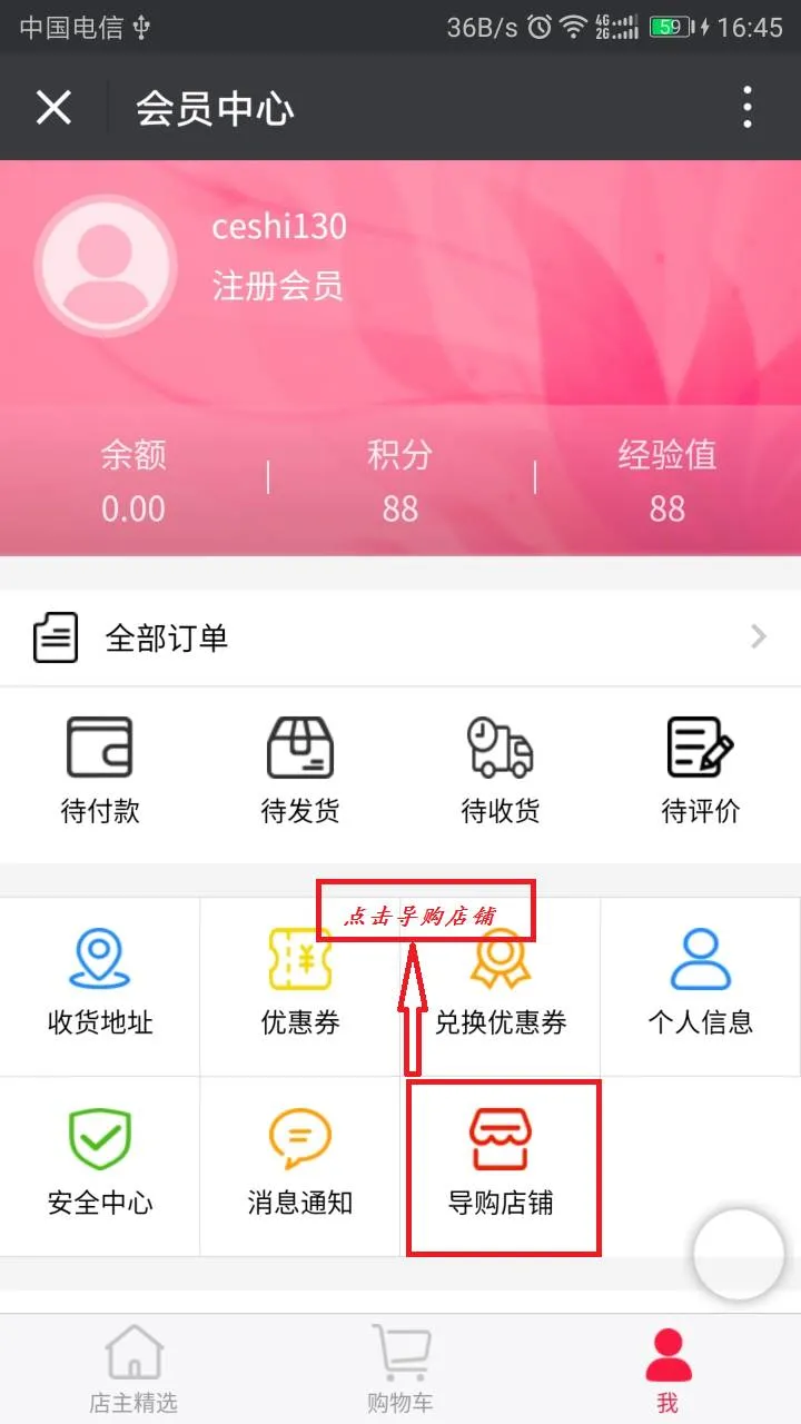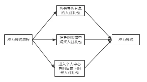 直接购买礼包(此情形适用于导购直接推送入驻礼包的情况)、搜索导购入驻指定礼包或在购买链接页面右下角“我”按键,点击“导购店铺”进入购买。购买前均需绑定个人手机号码。