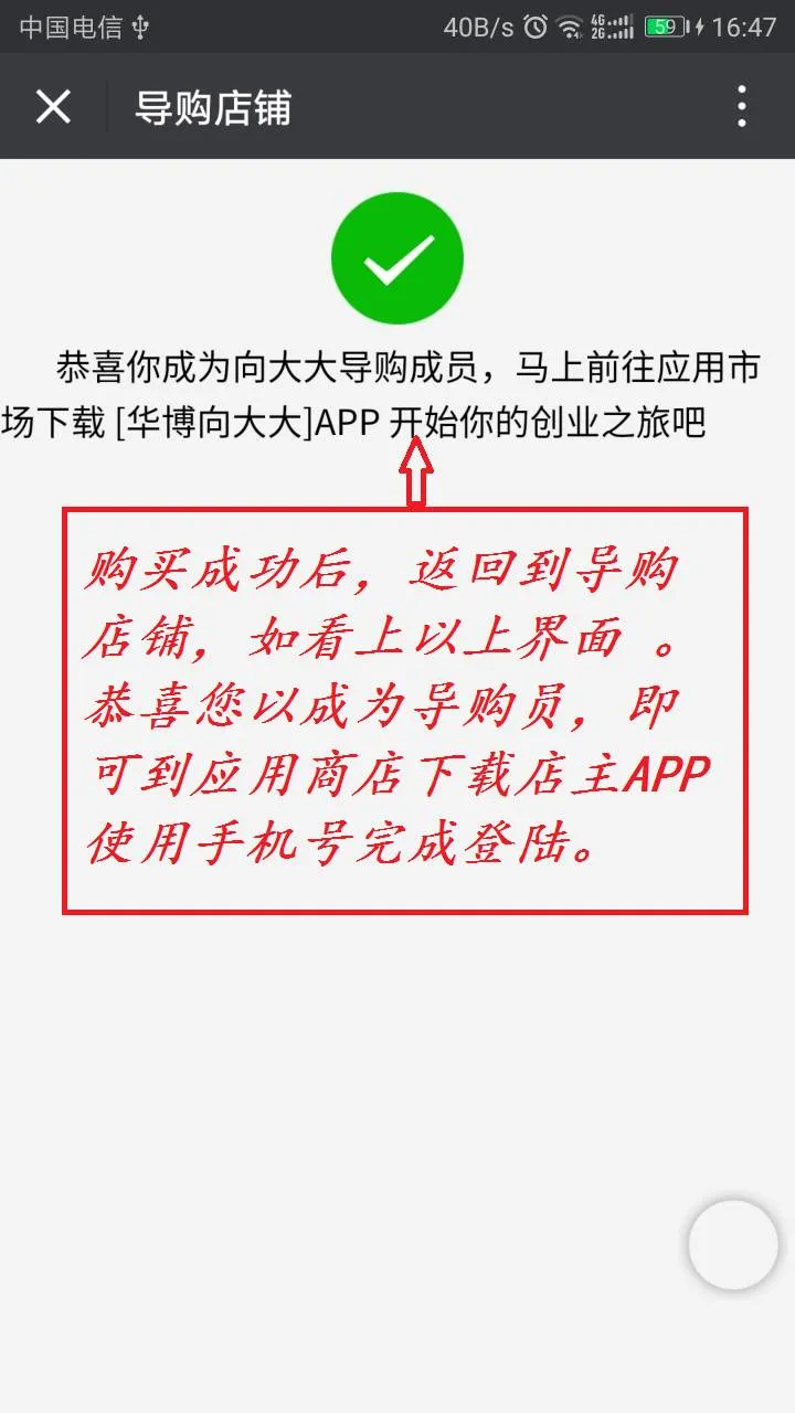 4.以上是普通购物流程,如果您希望成为导购以更加优惠的价格购买全部商品或开启华博向大大的创业之旅,通过分享平台商品或您的店铺赚取佣金的,都可以通过购买平台指定导购入驻礼包(其中有多个商品,购买任何一款均可成为导购)成为平台导购。
