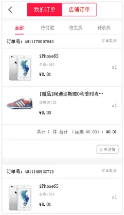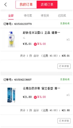 2)“店铺订单”,店铺订单有“全部”“待付款”“待发货”“已完成”的状态。是会员在店主店铺购买的商品订单记录。显示每张订单商品所得到的佣金。点击“订单详情”显示会员在店铺订单的详细描述。