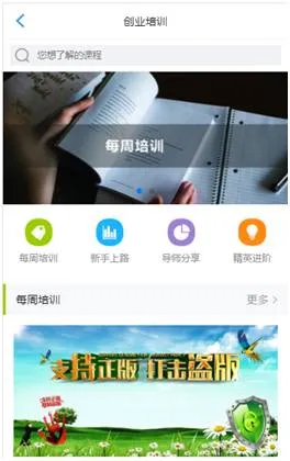 A、如上图中:此图版块为创业培训的课程表,分为“新手上路”“精英进阶”“导师分享”“每周培训”。店主可以更方便的订阅查看培训课程表。