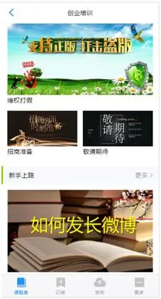2)创业培训底部导航功能列表,有课程表、订阅、发布、更多(我的收藏、历史阅读)的内容。