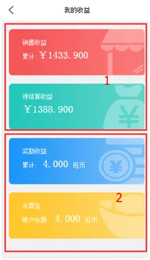 1)“我的收益”功能列表有“销售收益”“待结算收益”“奖励收益”“余额宝”。