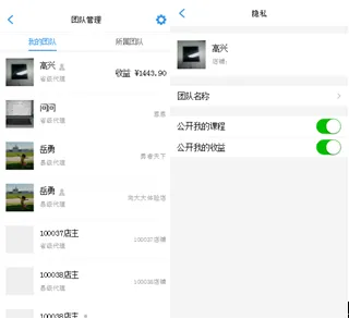 如上图中:此图版块是我的团队店主加入的团队,在我的团队中显示团队成员的店铺级别、店铺名称等。可以设置隐私“公开我的课程”“公开我的收益”等。