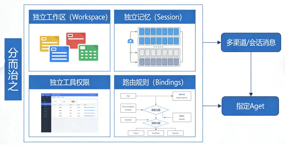 管理和使用多个 Agent 是让 OpenClaw 从“一个全能助理”升级为“一支专业团队”的关键。它的核心逻辑是“分而治之”:每个 Agent 拥有独立的工作区(Workspace)、独立的记忆(Session)和独立的工具权限,通过配置路由规则(Bind
