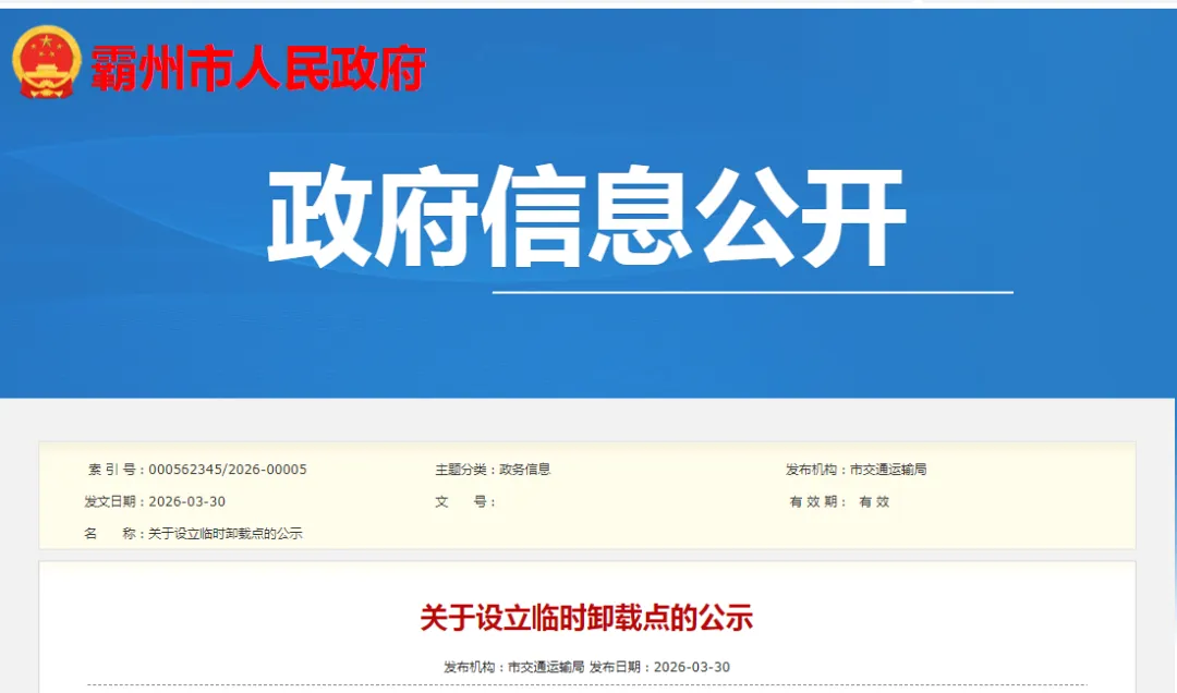 为严厉打击域内及途径霸州区域超限超载违法运输行为,合理布局我市车辆超限超载治理点位,严格规范治超检查和处罚行为,按照《超限运输车辆行驶公路管理规定》(交通运输部令2021年第12号令)和《交通运输部、公安部关于治理车辆超限超载联合执法常态化制度化工作的实施意见(试行)》(交公路发[2017]173号)要求,距离超限检测站较远的,就近引导至具有停放车辆和卸载条件的超限检测点接受检查处罚。现在霸州市G105线K100+980左侧设立临时卸载点一处:霸州市堂二里镇隆龙商砼院内,公示期为2026年3月30日。