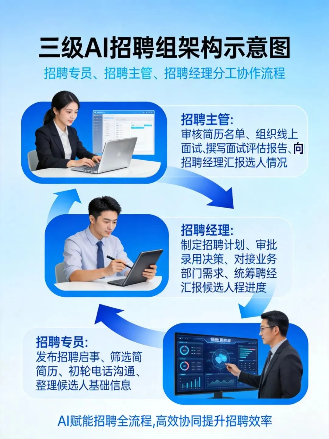 专员做"粗活":7×24小时筛简历 主管做"细活":深度匹配 + 面试调度 经理做"闭环":Offer自动发 + 数据报表