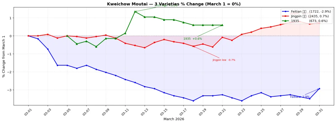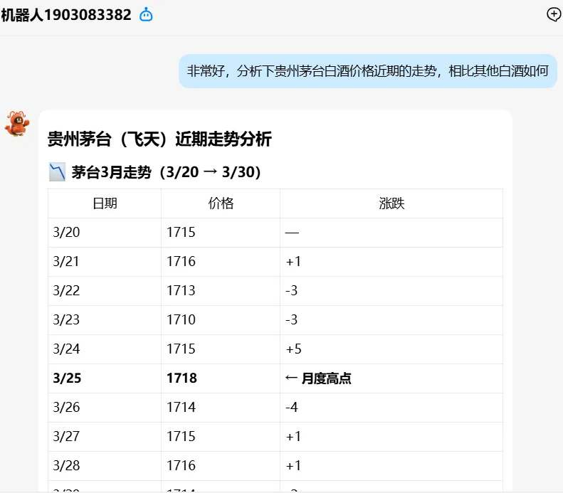 它不是一个概念演示,而是已经可以实际使用的能力,下面是精品茅台,飞天,1935的涨跌幅走势对比图。