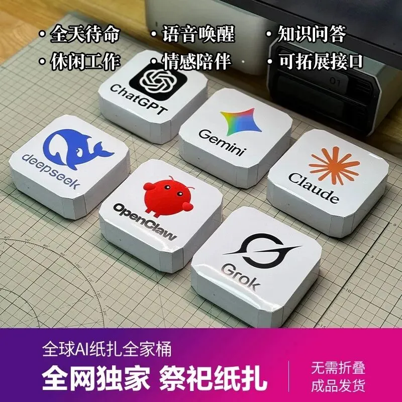 这款AI纸扎为纯手工纸质制作,采用迷你一体机造型,精准复刻热门AI模型的标志性设计,细节逼真。
