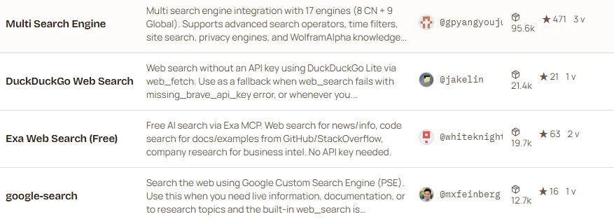 在日常工作和研究中,快速获取、整理和提炼信息是刚需。OpenClaw的技能市场(ClawHub)里有一大批专注于“信息获取”的技能,从多引擎搜索到智能摘要,从新闻监控到学术研究,帮你省下大量手动查找的时间。以下精选10款高下载量、高口碑的技能,每一款都经过大量用户验证。