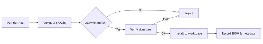 # 校验 SHA256 与白名单calc=$(shasum -a 256 skills/agent-commons.tgz | awk '{print $1}')grep -q "$calc" allowlist.json# 校验签名openssl dgst -sha256 -verify public.pem -signature agent-commons.sig skills/agent-commons.tgz