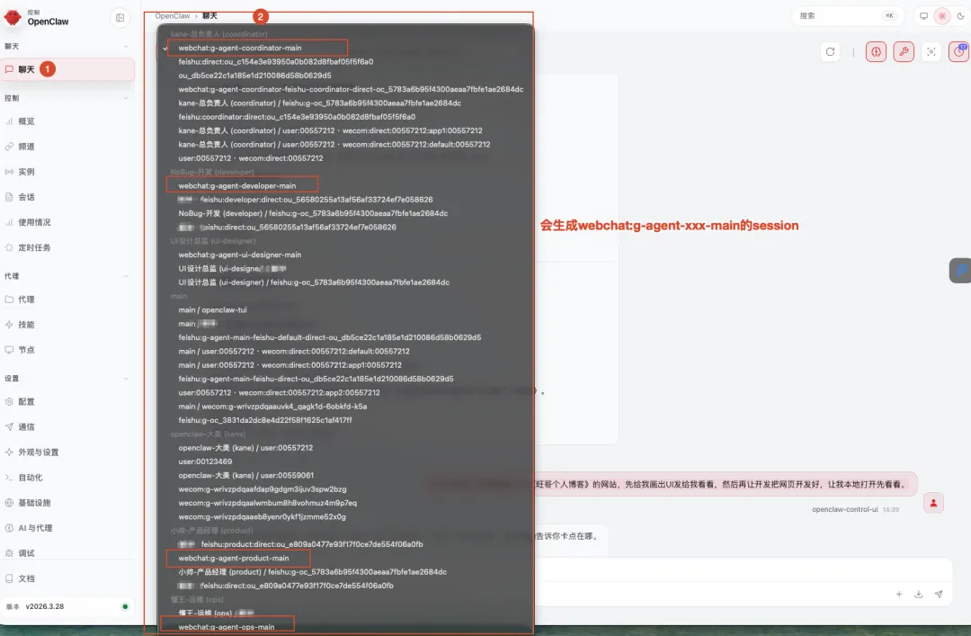 2.你会发现聊天页面会按规则自动生成agent间的session会话。