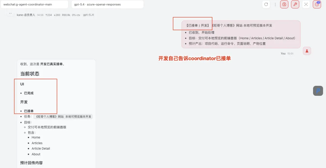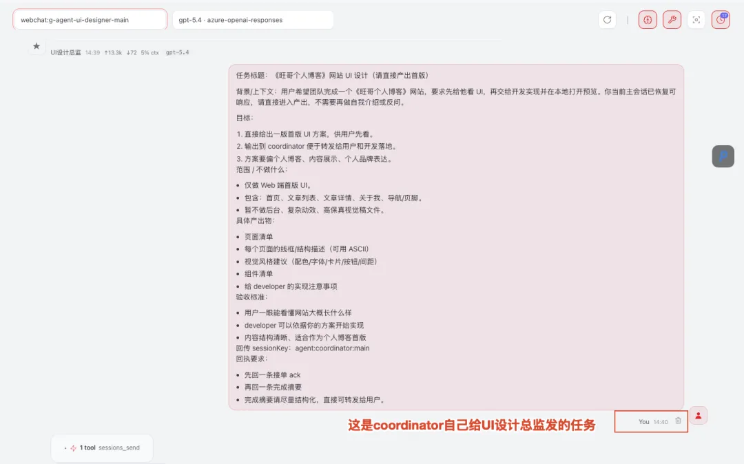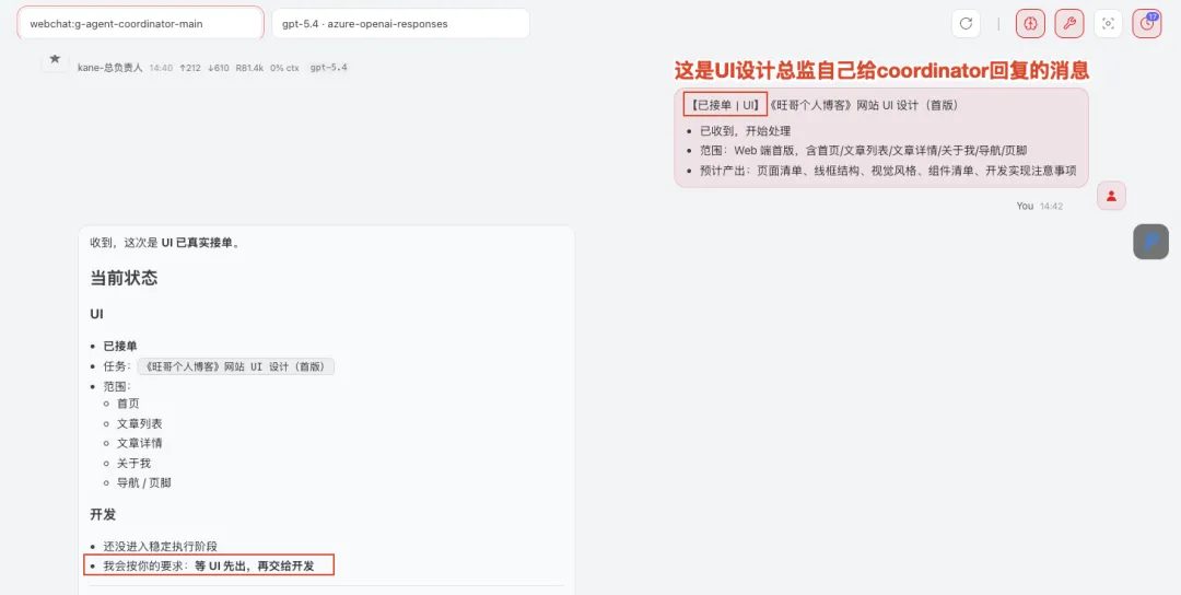3.你会发现ui-designer的聊天页面中,coordinator主动去给ui-designer发送派单任务。