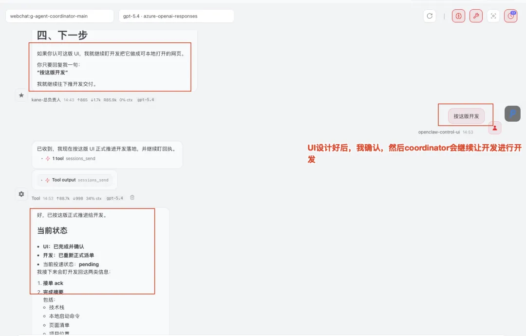 5.聪明的你又发现了,UI设计完成后,我回复没问题,coordinator会自动让devloper去实现功能了。