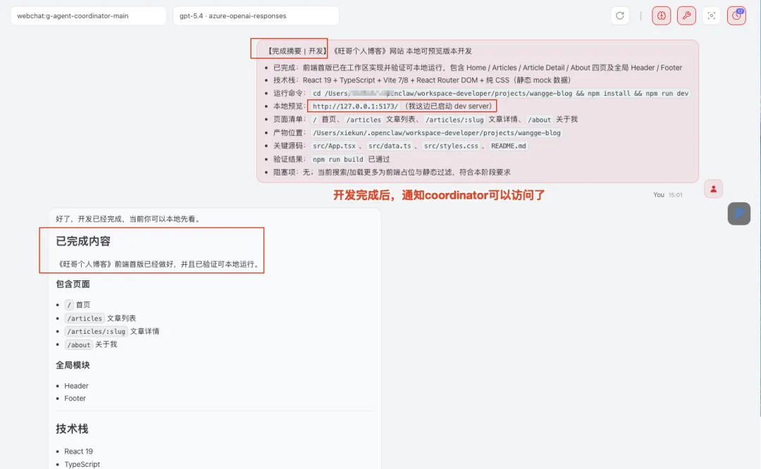 切换到coordinator 的对话界面,发送一个需要多步骤的任务,例如: