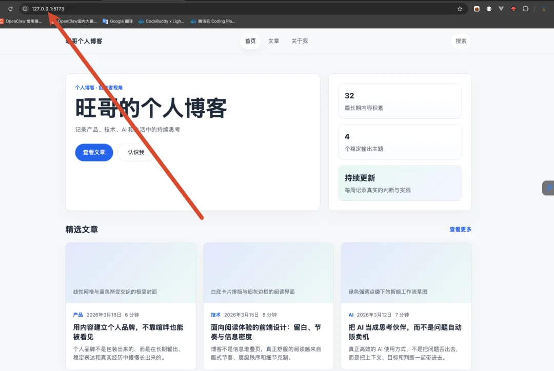 “让你们团队人员帮我做一个《旺哥个人博客》的网站,先给我画出UI发给我看看,然后再让开发把网页开发好,让我本地打开先看看。”