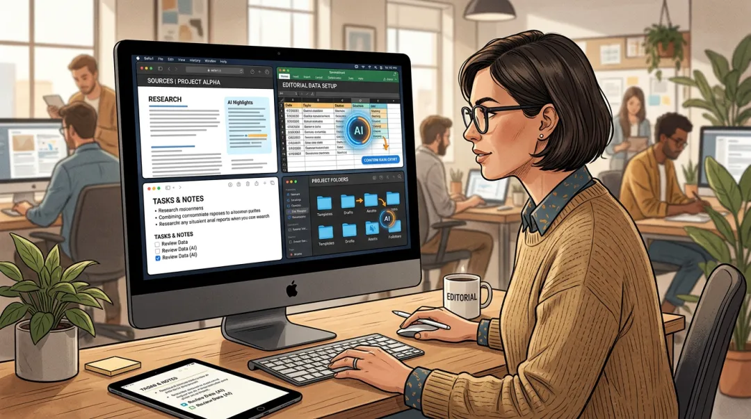 比如从聊天里找待办,去邮件或文档里补背景,再把相关的网页、文件和表格打开铺好,最后生成一版草稿或清单等你确认。