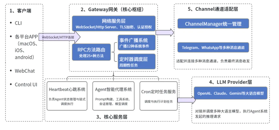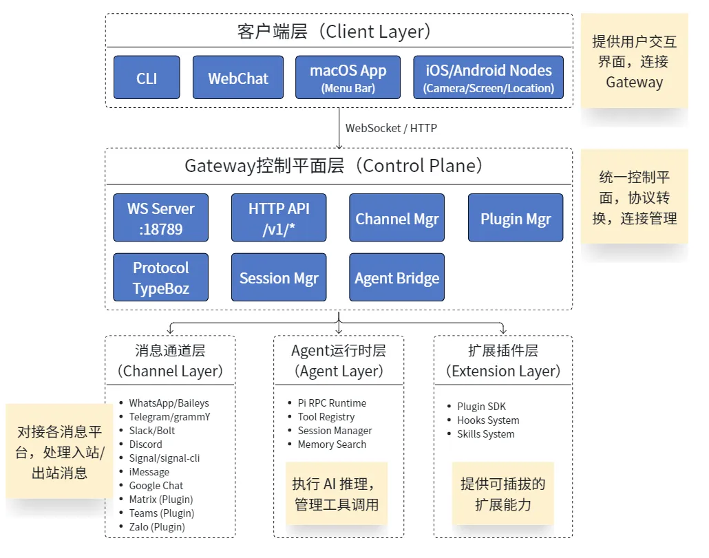 协议编排: 统一处理来自 CLI、Telegram、Web 等渠道的消息并标准化。 会话管理: 为每个「用户 × 渠道」维护独立 Session 状态。 指令队列: 采用 Lane-based 队列机制,确保指令有序、可靠执行。 实时流反馈: 通过 WebSocket 低延迟推送执行进度(打字状态、工具调用等)。