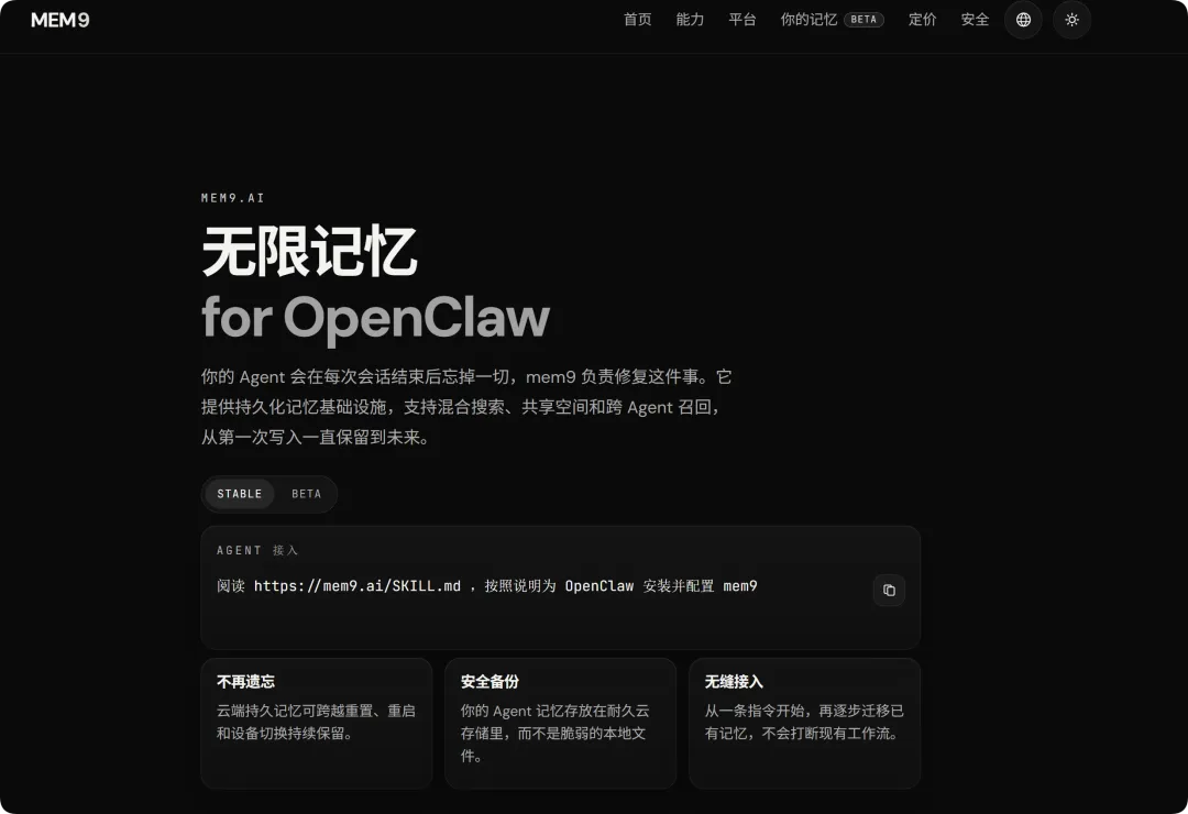 同类型的还有Mem9,目前免费版本的是支持1万条记忆,每个月1千次检索,个人使用来说是足够了,申请网址:https://mem9.ai,如图: