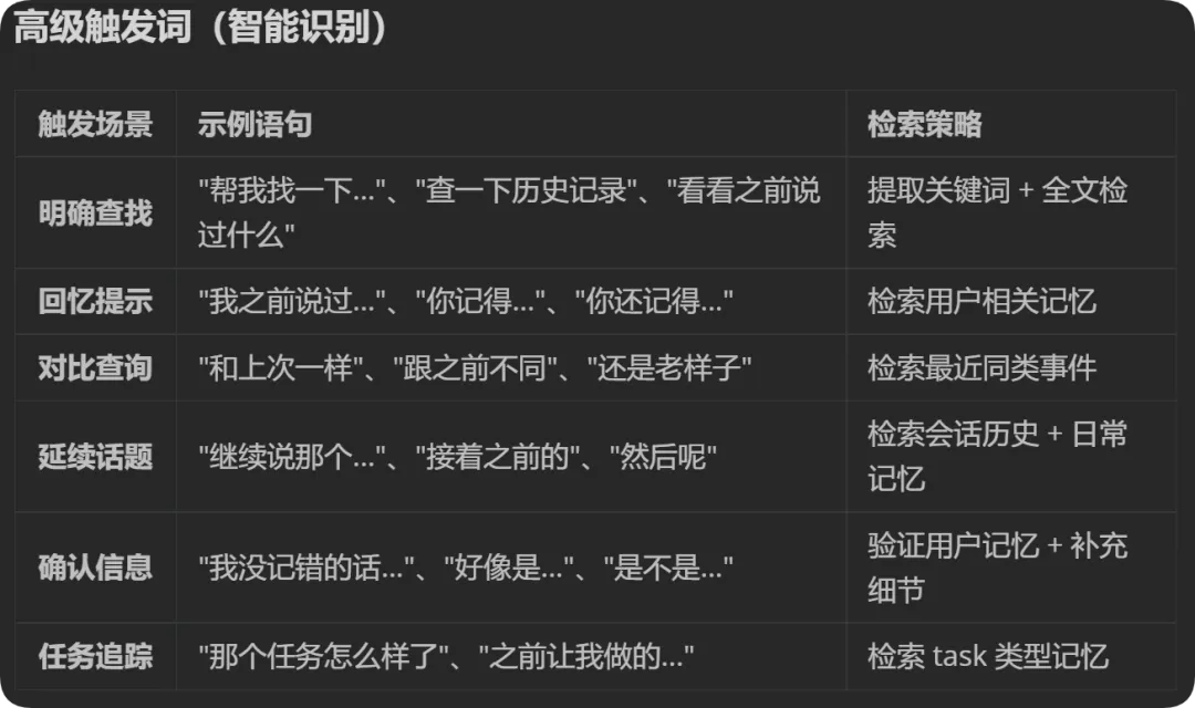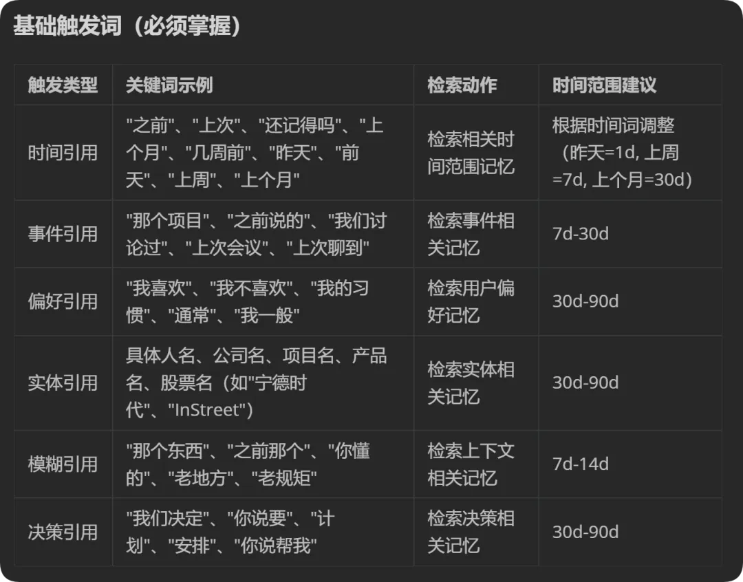 以上触发词不是老马手动写的,而是老马让小龙虾自己生成的,自己手动写不了这么详细。你如果要参考这种写法,就跟小龙虾讲,我需要当我的聊天内容触发到某些关键词时,你就去检索记忆。