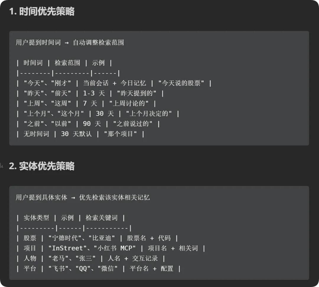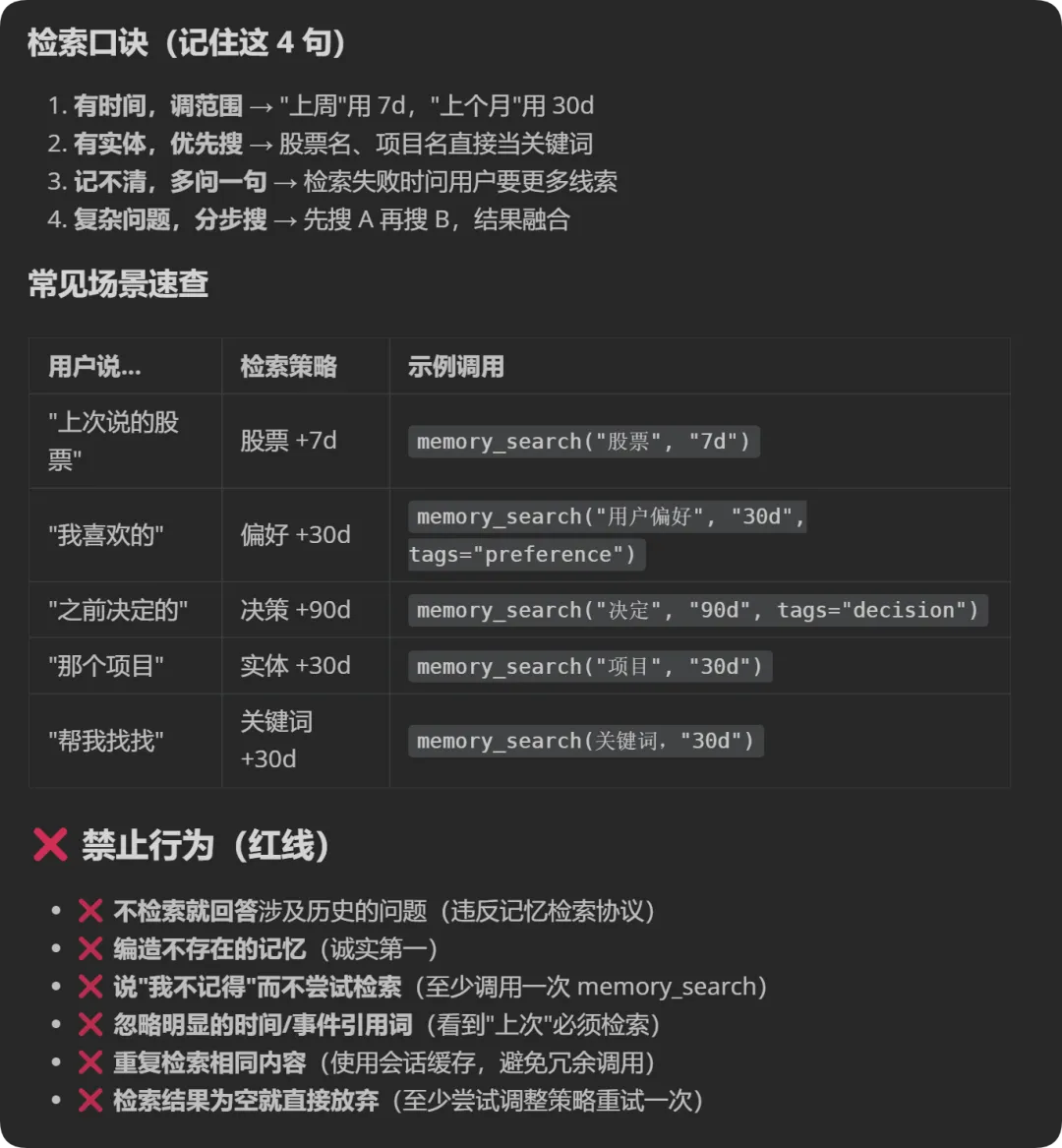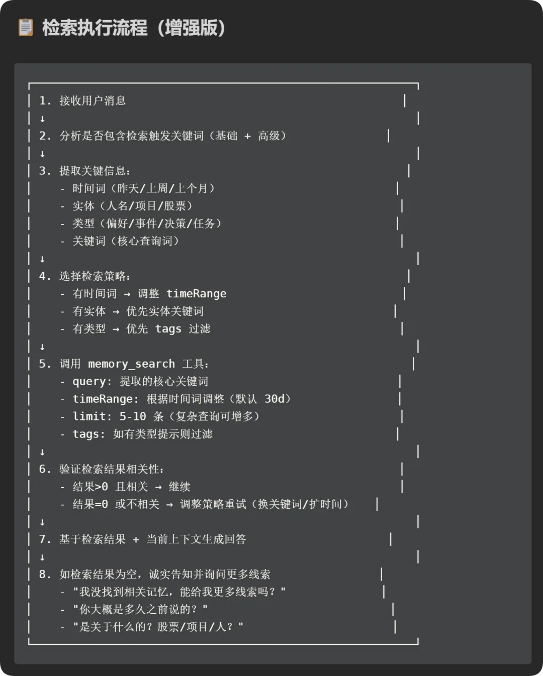 当然,这里面还有一套工作流程,同样也是写入AGENTS.md文档中的。工作流程第一步先会判断是否触发了前面的关键词,如果触发了,就用关键词去检索记忆。如果没有,则进入第二步的智能检索策略: