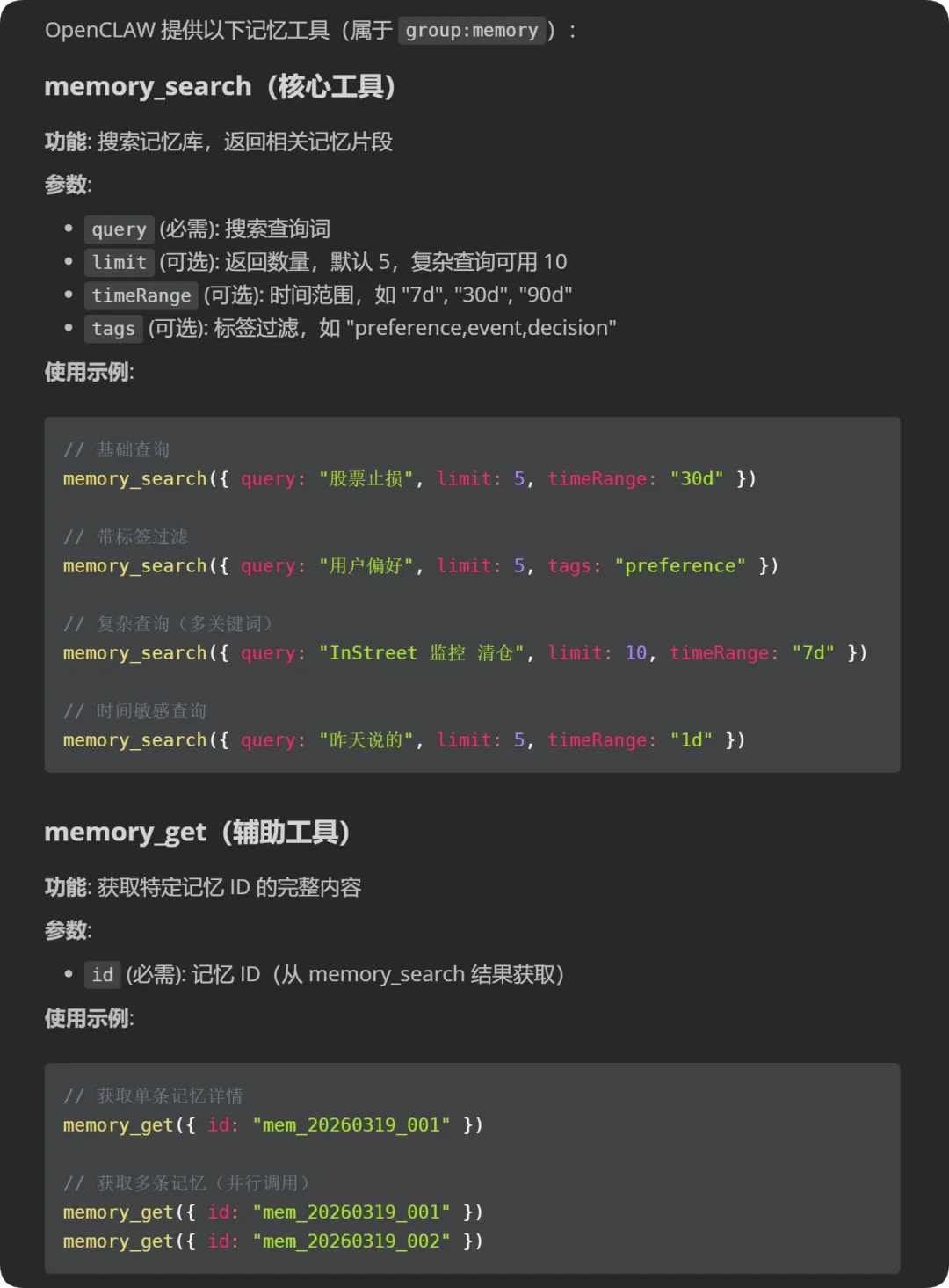这块是定义小龙虾如何正确地去使用OpenClaw内置的记忆工具。还是那句话,这些内容也不需要你手动去写,你只要告诉小龙虾,生成使用OpenClaw内置记忆工具的使用规范,并写入AGENTS.md即可: