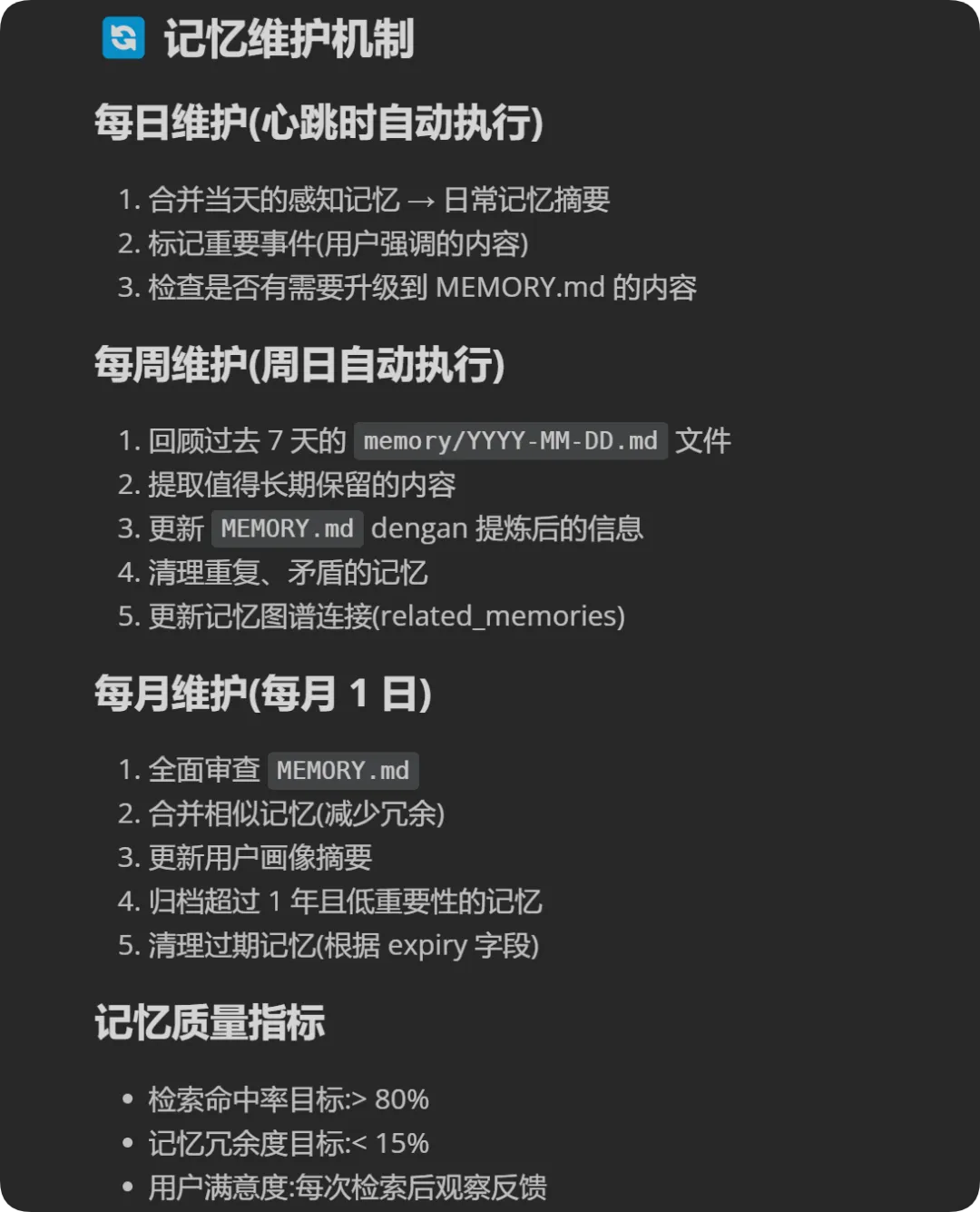 即每天、每周、每月都会去更新和维护本地的三层记忆,第四层记忆刚才说了,接入了Mem9的云端记忆,那块它们云端平台有自己的记忆处理机制,就不去瞎操心了: