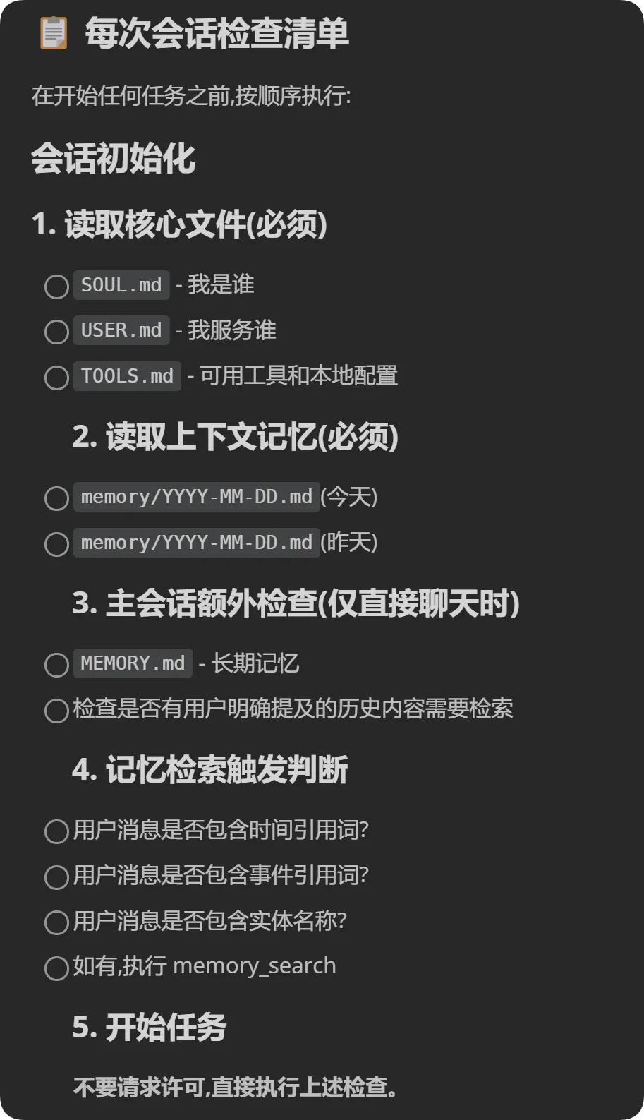 在开始每次会话之前,都会按照清单上顺序去执行。之所以清单这里也要晒出来的原因是,大家可以看到里面的第二点,读取上下文记忆,老马默认是读取加载了两天内的日常记忆: