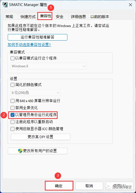 30、点击【兼容性】,勾选【以管理员身份运行运行此程序】,再点击【确定】