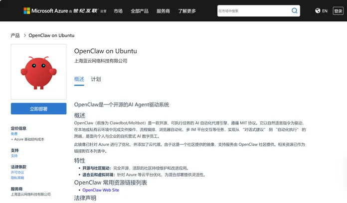 登录 由世纪互联运营的Microsoft Azure 市场,在搜索栏中搜索 “OpenClaw” ,即可看到并立即部署 “OpenClaw” 镜像。