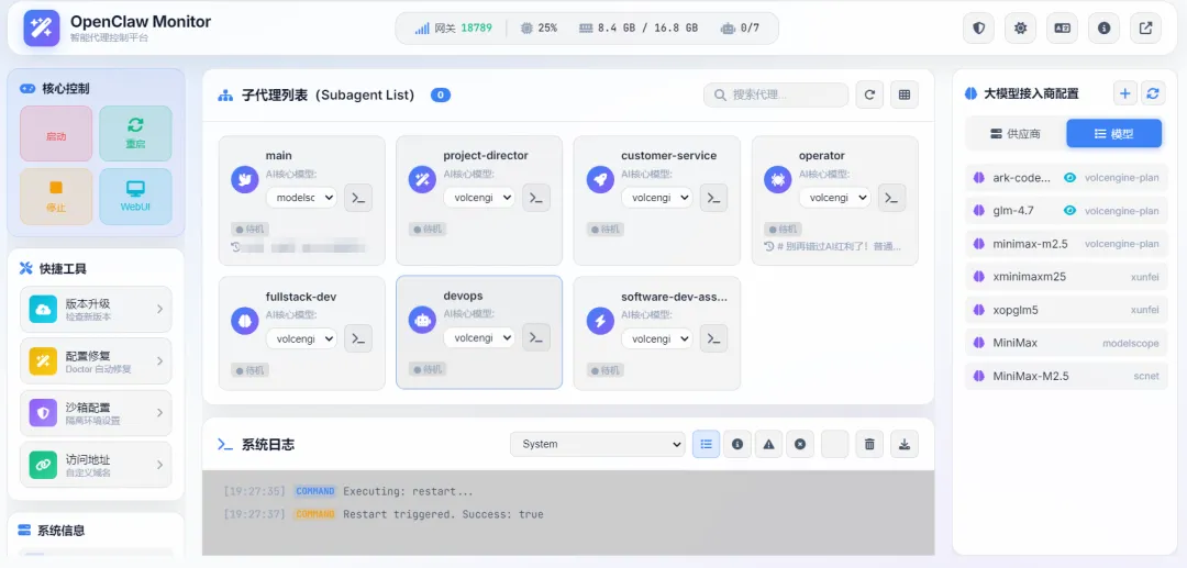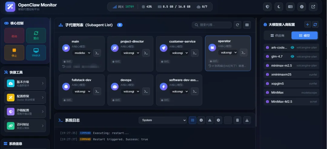 实时看到OpenClaw在不在跑、占了多少CPU内存 不用敲命令就能启动、重启、停止服务 集中管理多个大模型的API配置 直接在界面里看日志,不用满硬盘找