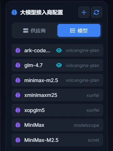 点"大模型接入商配置" 点"新增供应商" 填入名称、API地址、密钥 点"探测可用模型"获取模型列表 保存