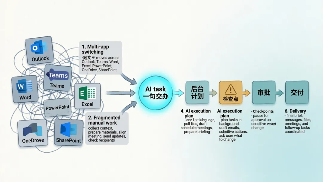 这个流程里我更在意的是它的执行方式。微软的描述不是“我给你一个答案”,而是“我先把任务拆成计划,在后台持续推进,中间设置检查点,必要时来问你,要改什么、要不要暂停、哪些动作需要批准”。这就很不一样了。AI 从一个会说话的助手,变成了一个有待办列表、有中间状态、还能回头找你确认的流程执行器。