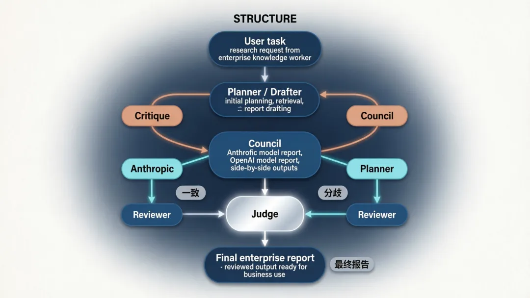 微软同一天发布的技术博客提到,Researcher 新加了两套多模型能力:Critique 和 Council。Critique 的逻辑是把“生成”和“评审”拆开,一个模型负责规划、检索、起草,另一个模型负责审稿、挑错、补强结构。微软直接点名,这里会组合使用 Anthropic 和 OpenAI 的模型。另一套 Council 更像模型评审会:Anthropic 和 OpenAI 的模型各写一份完整报告,再由裁判模型总结它们在哪些地方一致、哪些地方分歧、各自漏掉了什么。